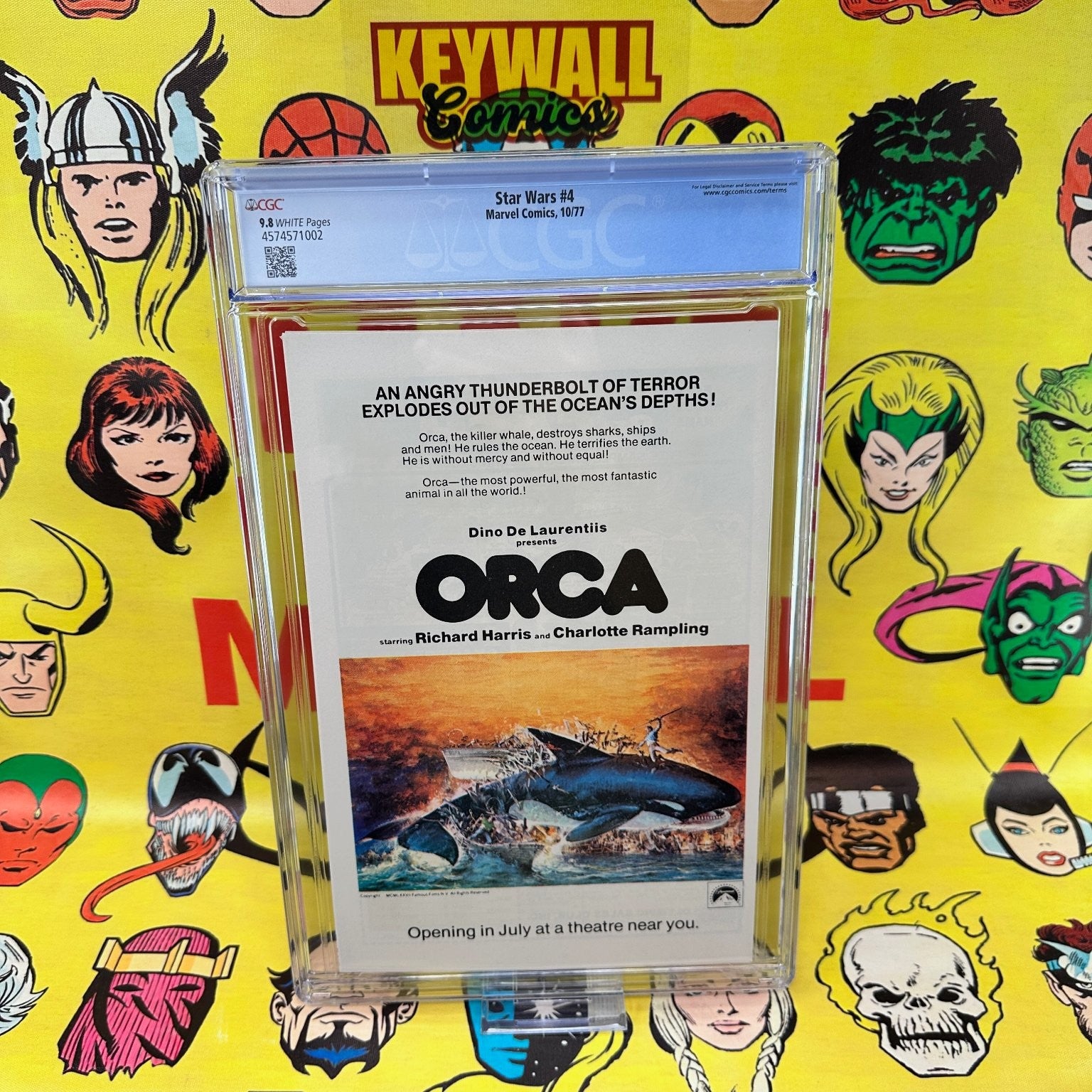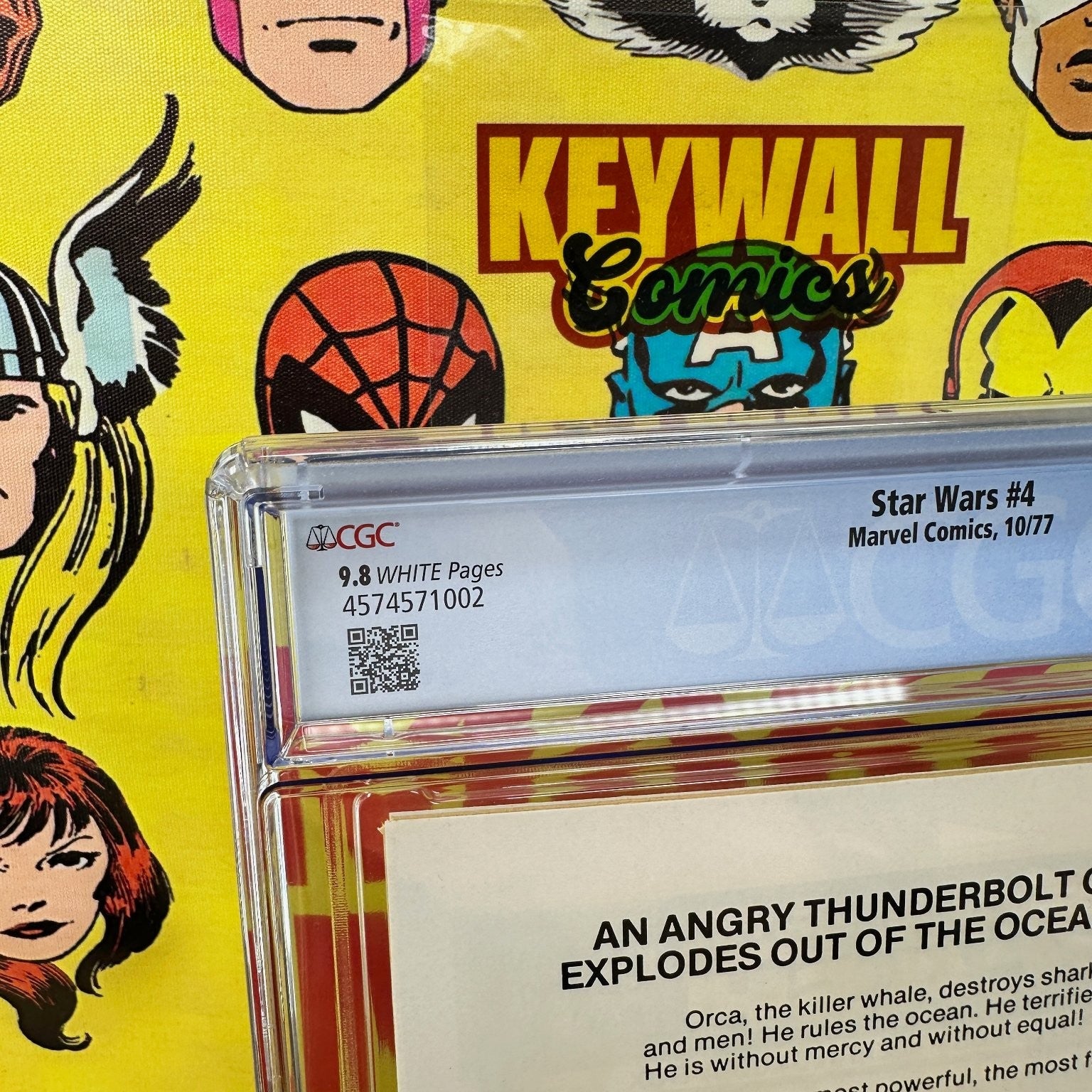 This is a CGC graded 9.8 copy of Star Wars #4, published by Marvel Comics in October 1977. This issue is part 4 of the "Star Wars: A New Hope" movie adaptation and features the "Death" of Obi-Wan Kenobi. The comic includes a story by Roy Thomas, with artwork by Howard Chaykin and Steve Leialoha, and a cover by Rick Hoberg & Frank Giacoia. The cover price is 30 cents.